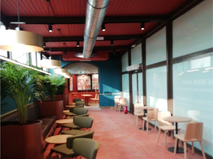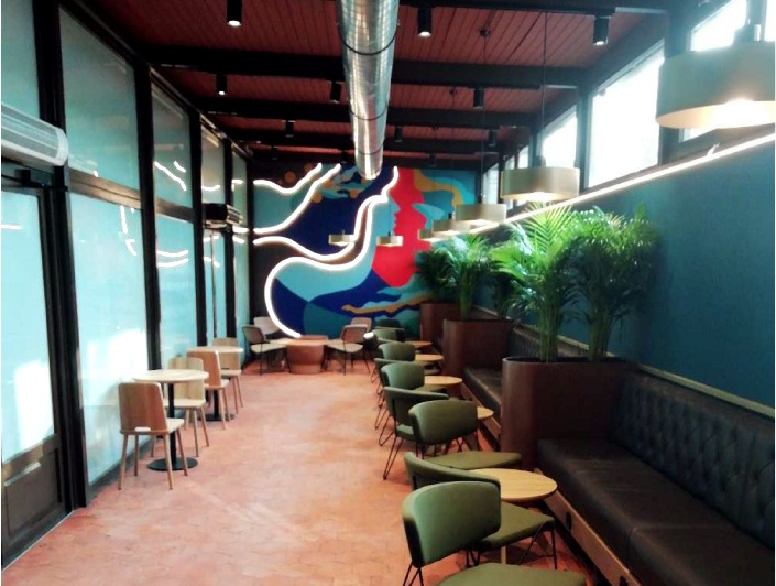 Le design de l’espace repose sur une esthétique contemporaine et chaleureuse, où les tons chauds, les matériaux naturels et un éclairage stratégiquement réparti créent une atmosphère invitant à la détente et au confort, favorisant ainsi le temps passé sur place. Le mobilier a été sélectionné à la fois pour assurer le confort des clients et pour optimiser les flux dans un environnement à forte fréquentation.