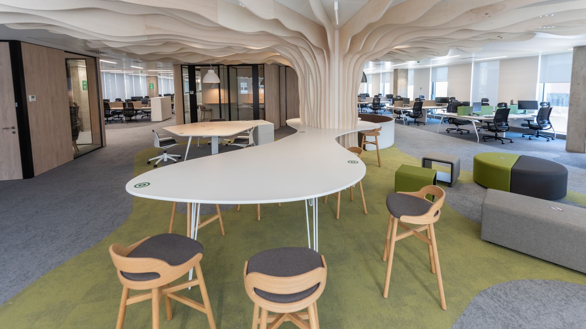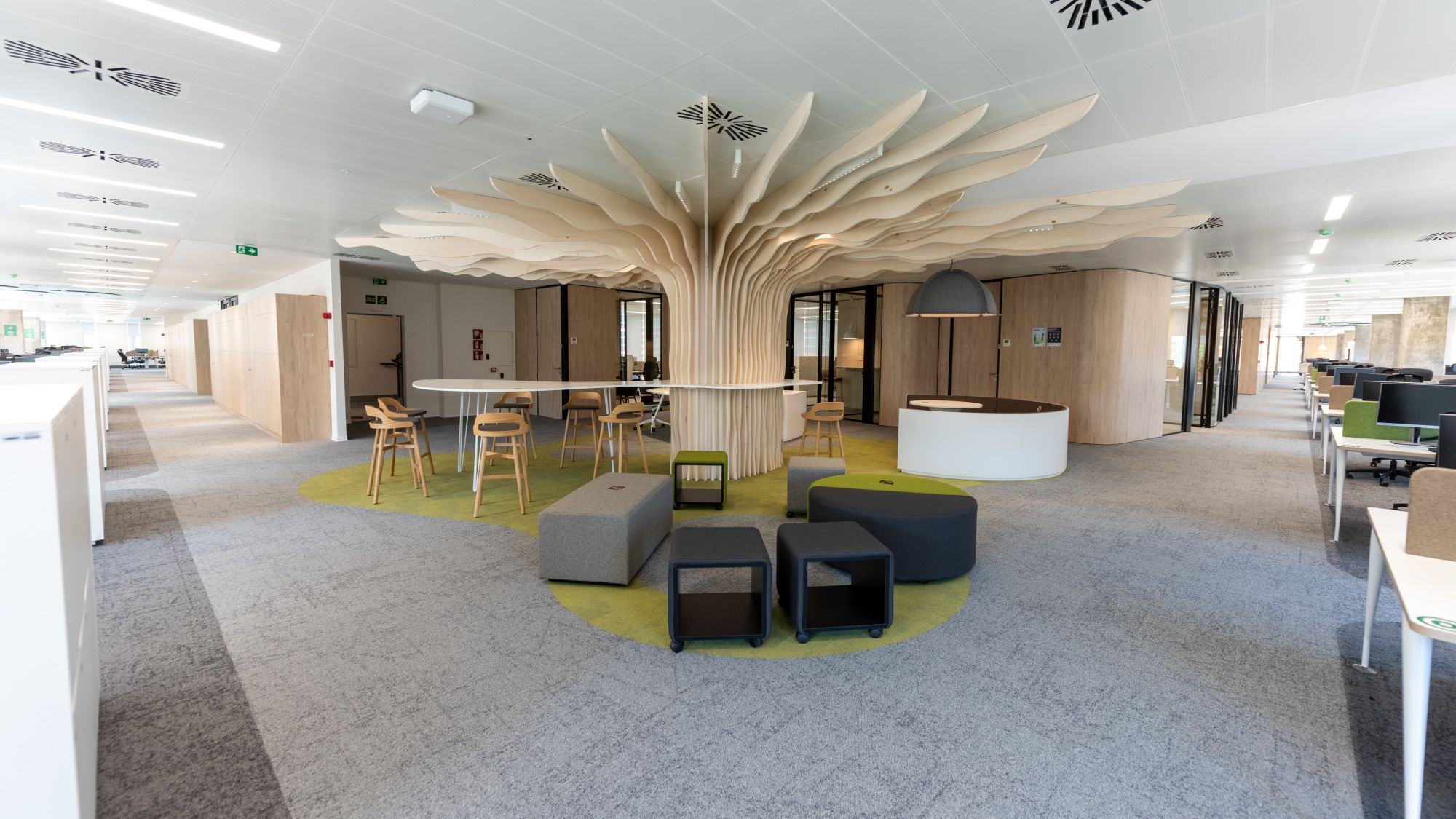 In addition to the spacious and bright workspaces, the new headquarters features collaboration rooms inspired by comfortable, natural and home-like environments, transforming the office into a calm, inspiring and healthy environment. Contributing to this are spaces such as "the agora" with a large work table under a "tree" in the middle of the office, freeze-dried plants, the work cafeteria and restaurant, which is also open to the community, and the wellness area (medical and nursing spaces). Other dynamic environments, such as lounges, telephone booths, meeting rooms, training and auditorium, are also accessible to the community. Materials, such as wood, earth tones and green vegetation, have played an essential role in the project, making the headquarters a unique and innovative working environment.
