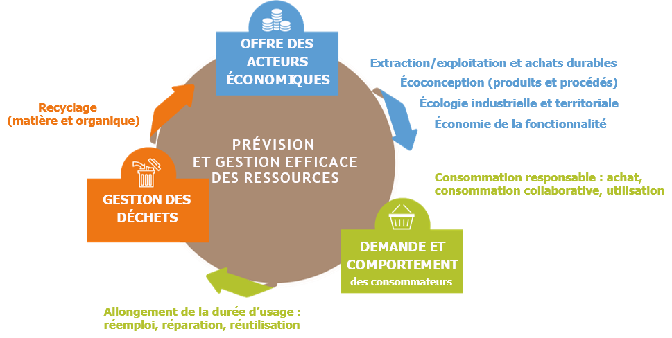 Les domaines et les piliers de l’économie circulaire. Adapté de « L’économie circulaire. 3 domaines, 7 piliers », par l’ADEME